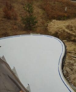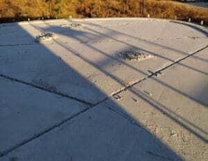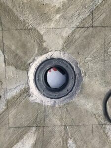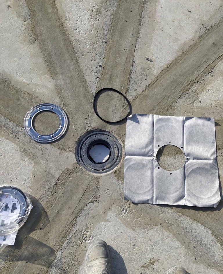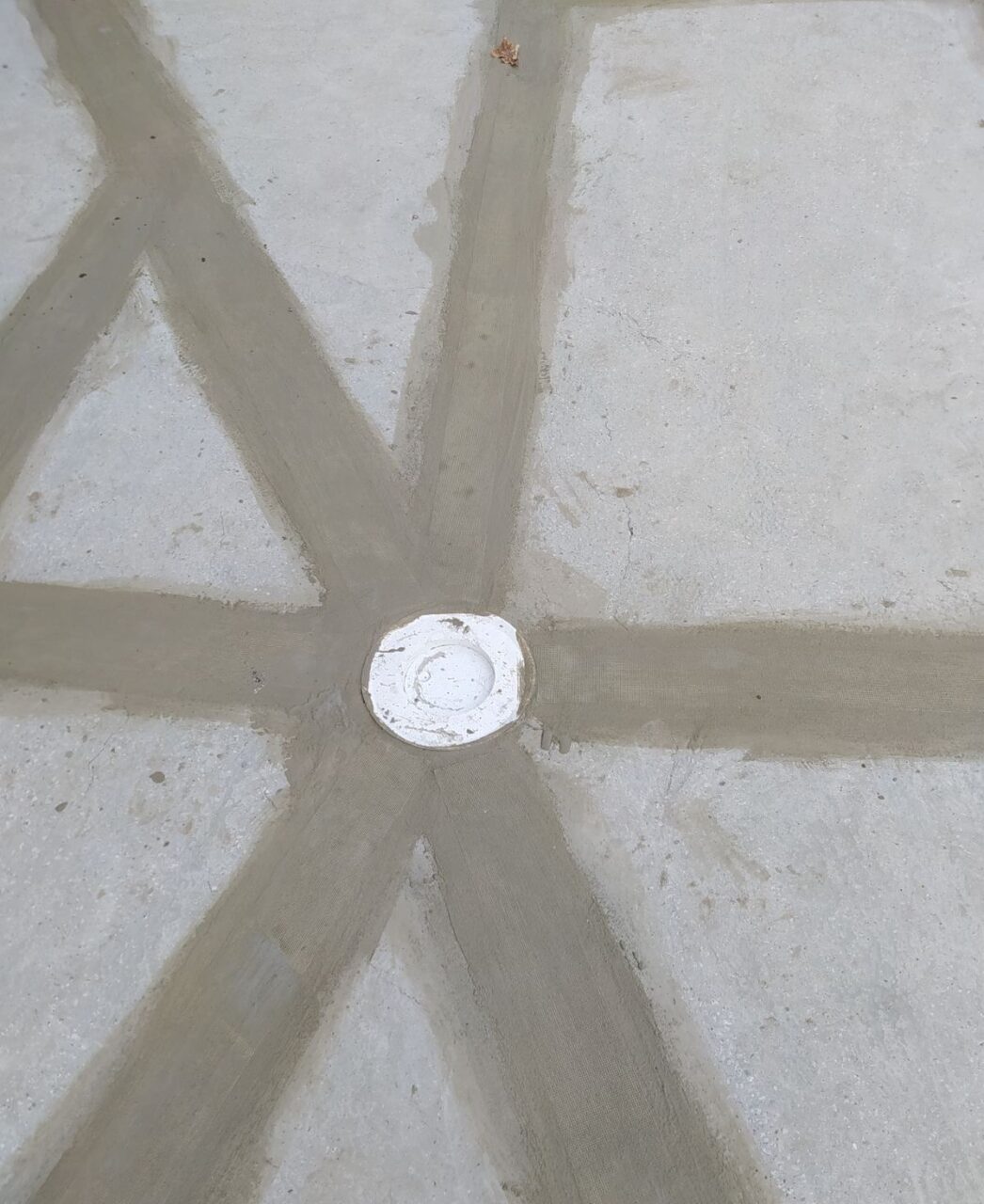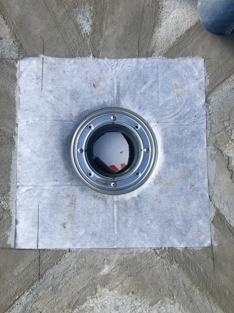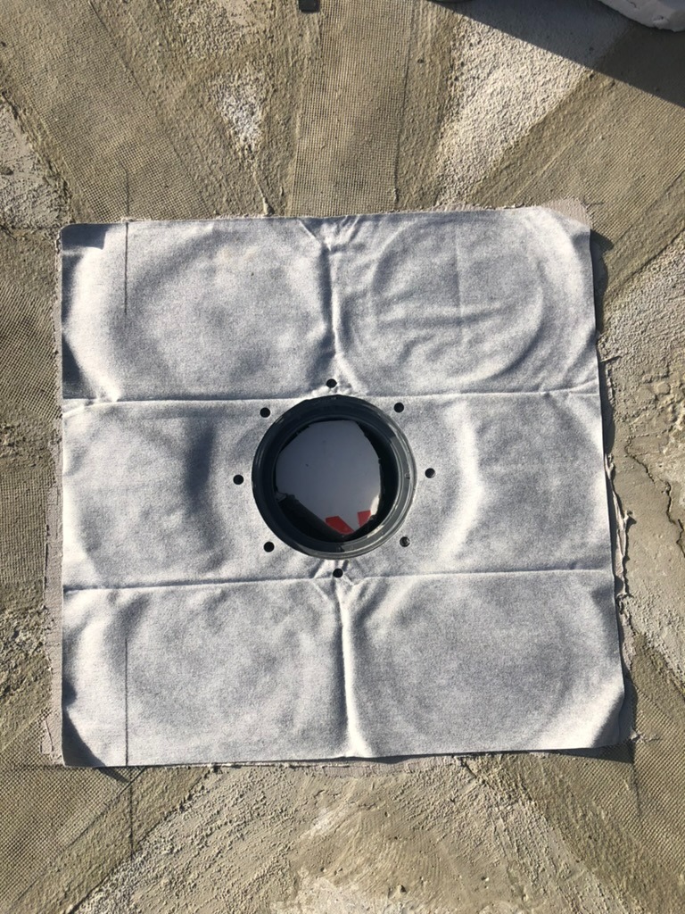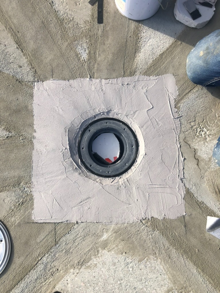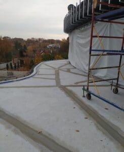 - Підготовка та монтаж систем: Очищення основи та встановлення зливних воронок і лотків. Герметизація примикань зливних елементів виконана за комбінованим принципом: стик ущільнено поліуретановим герметиком, після чого вузол жорстко зафіксовано ремонтною сумішшю KRYS RM FAST.