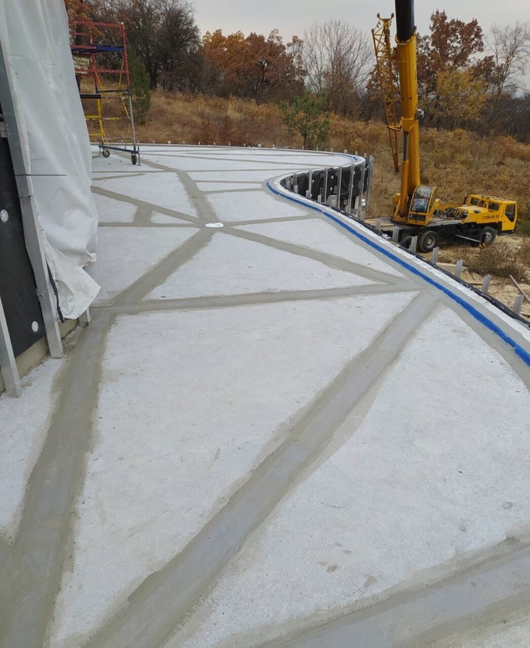- Армування: Всі примикання, а також зони навколо лотків та воронок додатково посилено шаром еластичної гідроізоляції KRYS FLEX із втопленням армуючої склосітки.