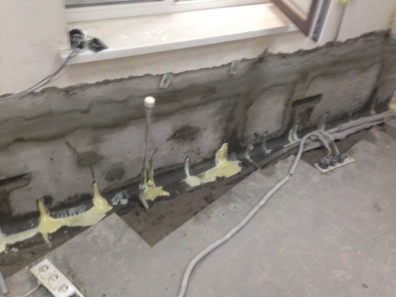 Примикання стіна-підлога, стіна-стіна, стіна-стеля (якщо висота зони гідроізоляції доходить до стелі) робимо штробу шириною 30 мм і глибиною 30 мм відбійним молотком при роботі зсередини і наполегливо рекомендуємо також виконувати ці роботи і ззовні