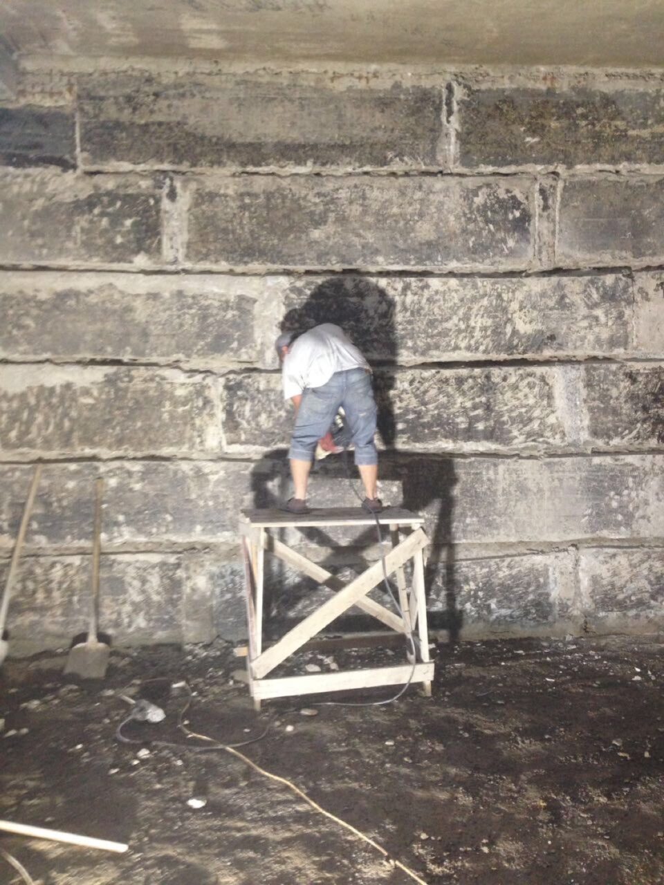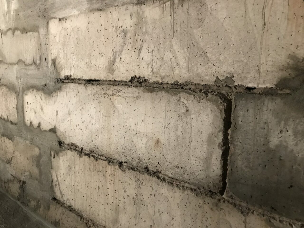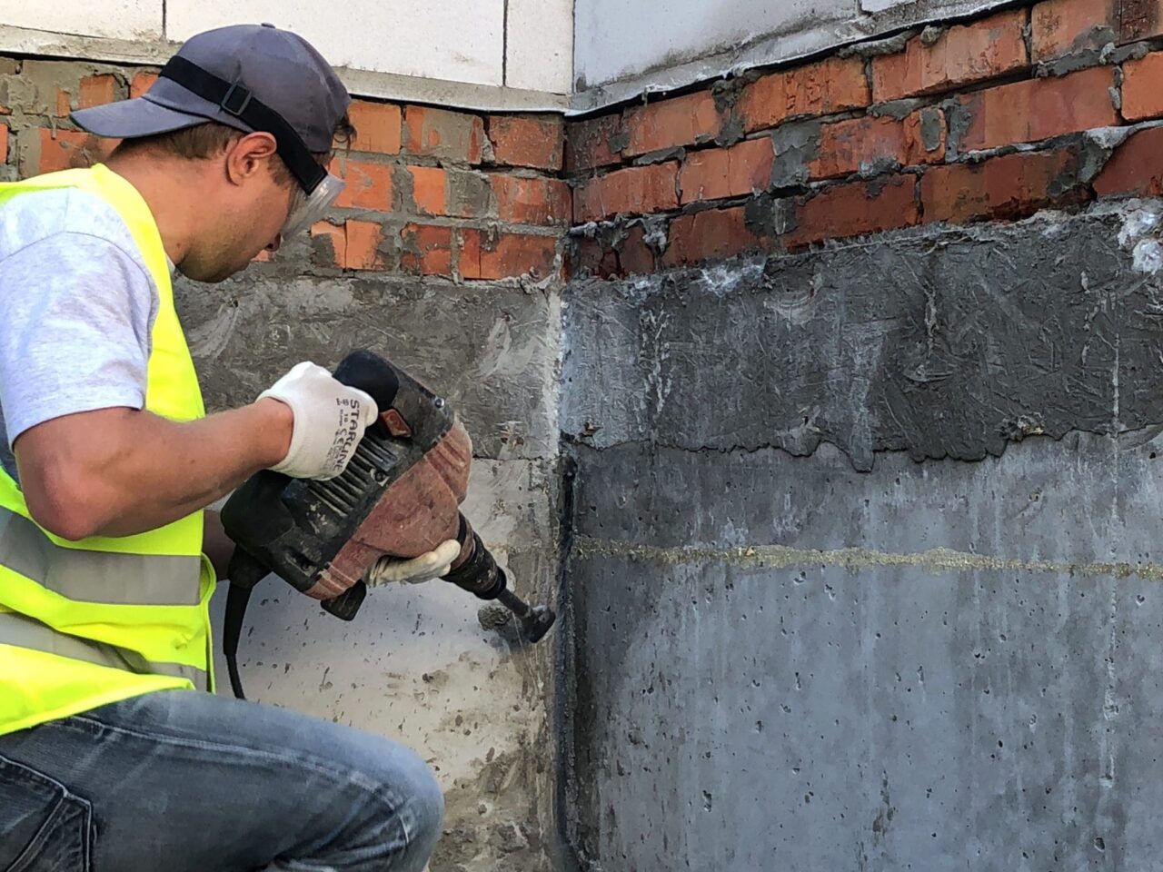 При виконанні гідроізоляції зсередини обов’язково вибиваємо розчин з усіх міжблочних швів відбійним молотком в зоні гідроізоляції на глибину 30-40 мм. При роботі ззовні допускається не вибивати міжблочні шви (але ми рекомендуємо все ж це зробити), але потрібно грунтовно вимити, вичистити і вирівняти поверхню, навіть шляхом шліфування.