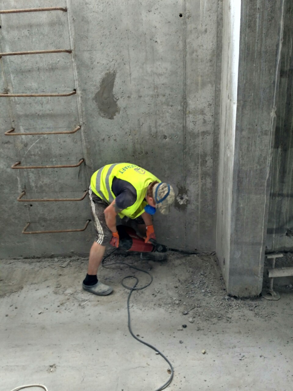 При виконанні гідроізоляції зсередини обов’язково робимо штробу по примиканням стіна-підлога, стіна-стіна, стіна-стеля (якщо висота зони гідроізоляції доходить до стелі) робимо штробу шириною 30 мм і глибиною 30 мм відбійним молотком при роботі зсередини і наполегливо рекомендуємо також виконувати ці роботи і з зовнішньої сторони. По примиканням також робимо невелике скруглення за допомогою ремонтного матеріалу KRYS RM Fast (в незалежності ззовні чи зсередини). В такому випадку значно знижується напруга гідроізоляційного покриття на стику. Отримані оброблені штроби по примиканям також запаковуємо ремонтною сумішшю KRYS RM Fast.